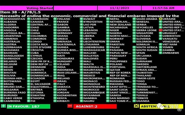 去年联大谴责俄罗斯入侵乌克兰,美国和西方国家沾沾自喜,你看,全世界141票赞成谴责,5票反对,35票弃权。但,跟全世界谴责美国的古巴提案比起来,完全是小巫见大巫,那是全世界清一色谴责美国。