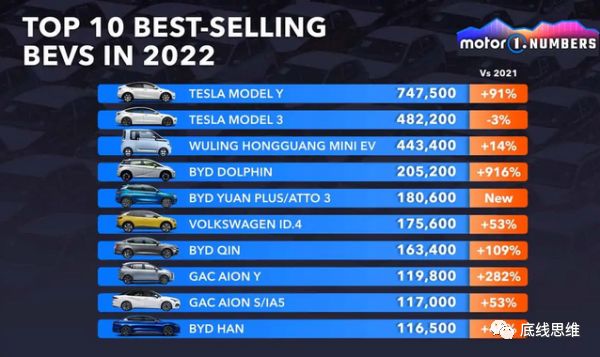 中国电动汽车市场的发展迅猛,2022年全球纯电动车销量前10名中有7名来自中国品牌,特斯拉两款车型销量暂时领先