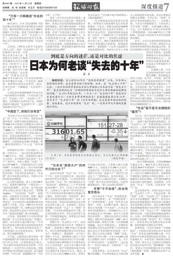 编者的话:自上世纪90年代“泡沫经济崩溃”以来,日本陷入经济增长停滞、企业竞争力低下的时期。如今,在“失去的三十年”之后,一些日本经济学家和企业家又开始担心日本会不会“再失去十年”,甚至悲观地认为“长期的经济低迷不是什么增长战略就能解决的问题。”从1991年到2023年,一个又一个“失去的十年”到底对日本意味着什么?又给日本带来哪些改变?本报邀请旅居日本35年、亲历多个“失去的十年”的《日本华侨报》总主笔蒋丰讲述他的观察。在他看来,谈日本经济的“失去”时,一定离不开与中国的发展进行对比。