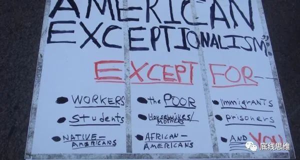 例外主义的讽刺画:例外主义就是排除美国下层民众包括工人、学生、家庭妇女、非裔美国人、移民等群体的主义