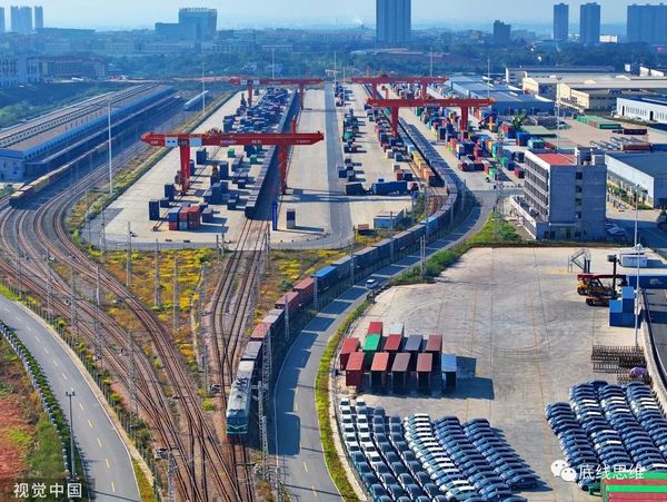 2023年12月6日,江西省赣州市南康区,满载比亚迪新能源汽车的货运列车驶出赣州国际陆港。