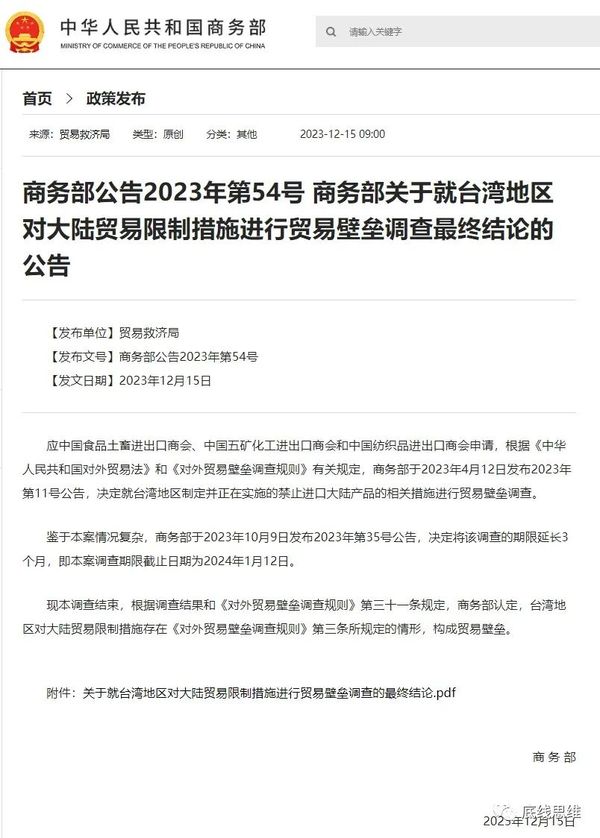 大陆于12月15日公布调查结果,并认定台湾对大陆限制措施构成贸易壁垒后,绿营端出了早已准备好的说法:“中国介选”,大陆违反WTO相关机制与规范,而蓝营与中共里应外合,呼吁北京停止政治操弄。