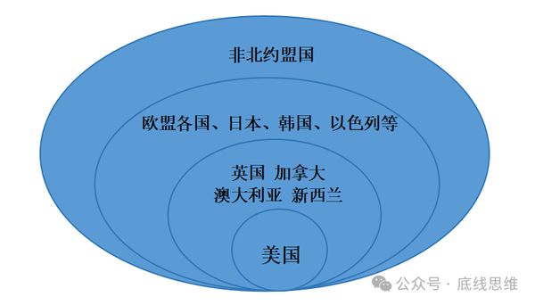 根据这些联合声明,以及美西方国家间以及与盟国间的一系列多边和双边协定,可以大致上勾画出这个正在形成中的美西方世界帝国的基本轮廓,即一个包括内外四层的同心圆结构。