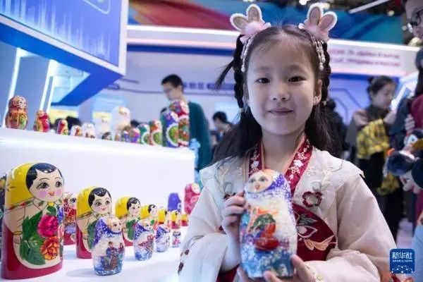 5月17日,正在中国进行国事访问的普京,曾前往哈尔滨出席第八届中俄博览会开幕式。图为5月19日,在第八届中俄博览会现场,一名小朋友拿着俄罗斯套娃拍照。图|张涛