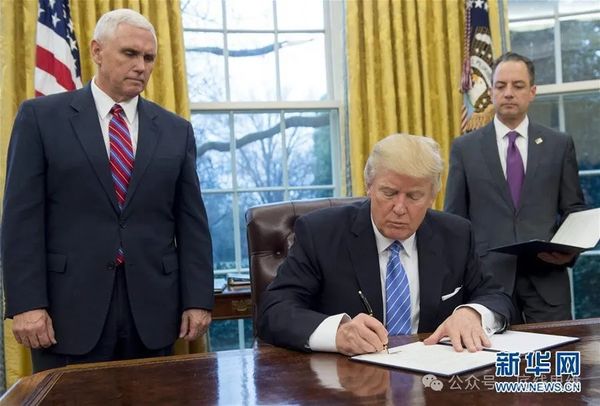 2017年23日,在美国华盛顿白宫,时任总统特朗普(中)签署行政命令,正式宣布美国退出跨太平洋伙伴关系协定(TPP)。新华网