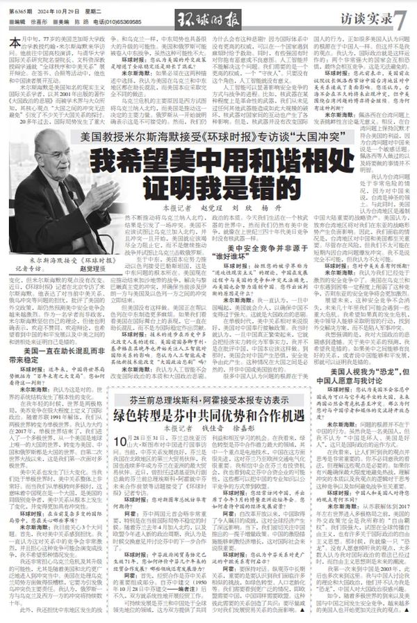 米尔斯海默接受《环球时报》专访谈“大国冲突”