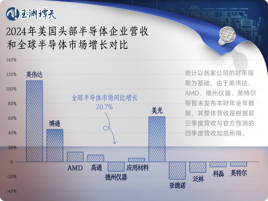 2024年,全球芯片市场都在回暖,预计同比增长20.7%。与此同时,英伟达2024年营收预计同比增长超100%,成为美国芯片市场增长最大的动力。