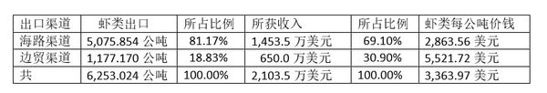 这样出口时,海路渠道出口占了较大的比例。边贸渠道出口的虾类重量不到总出口量的五分之一,但所获收入却占总收入的三成以上比例。造成这样的原因,就是所获价钱不同所致。海路出口时,每公吨虾所获不到3千美元,而由边贸出口时,每公吨价钱却在5千美元以上。