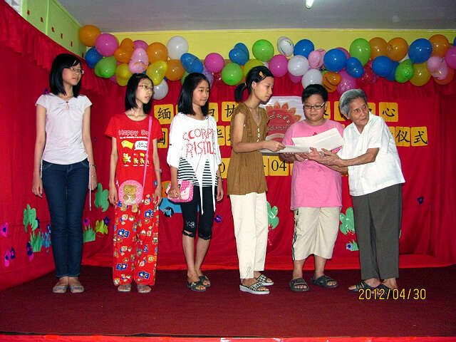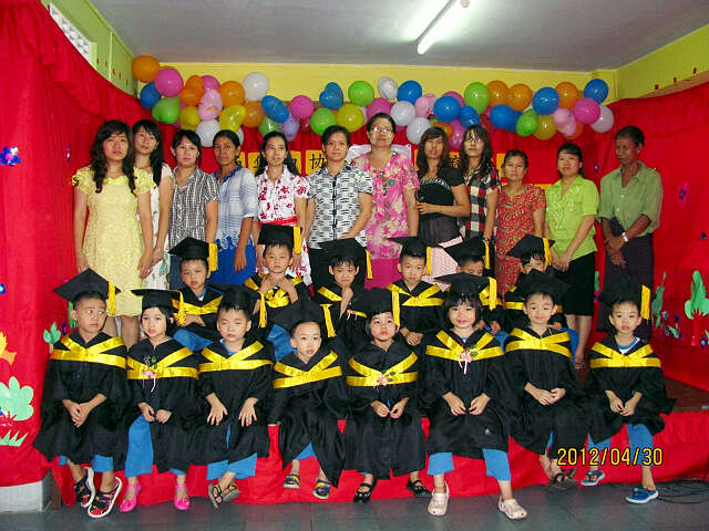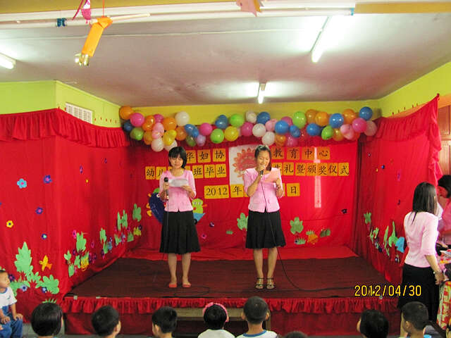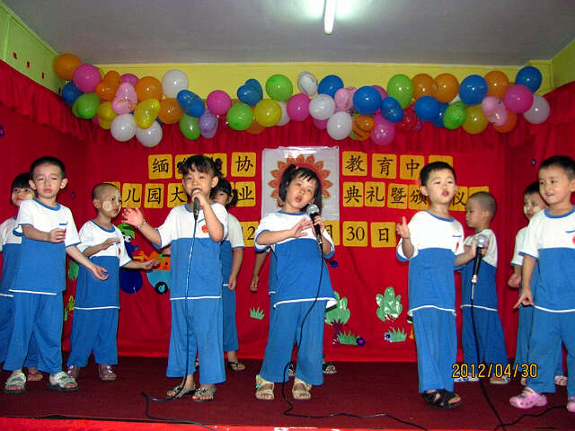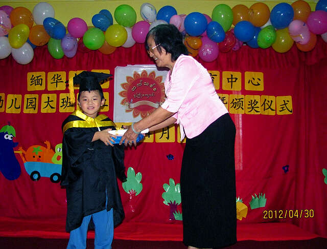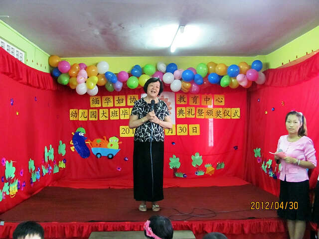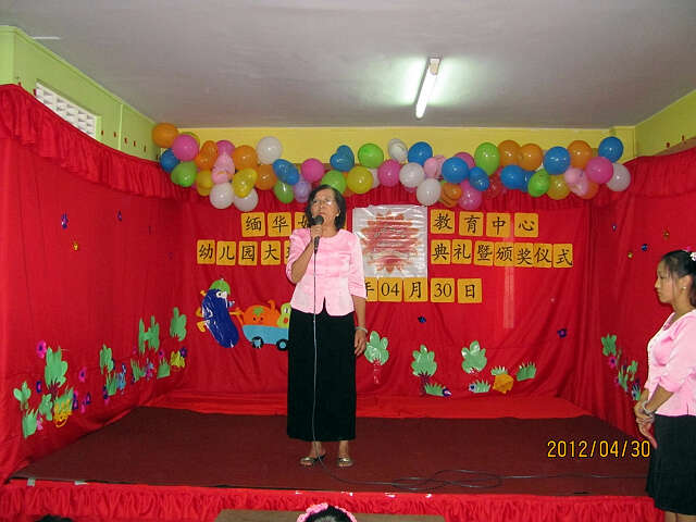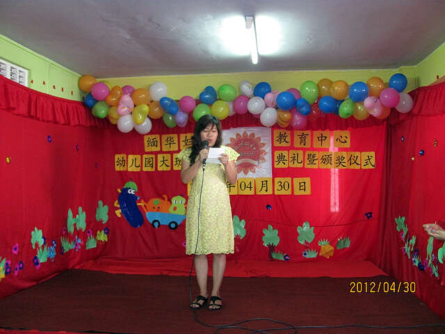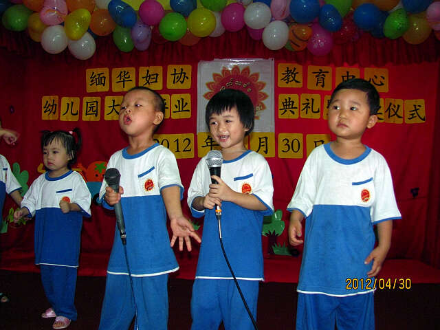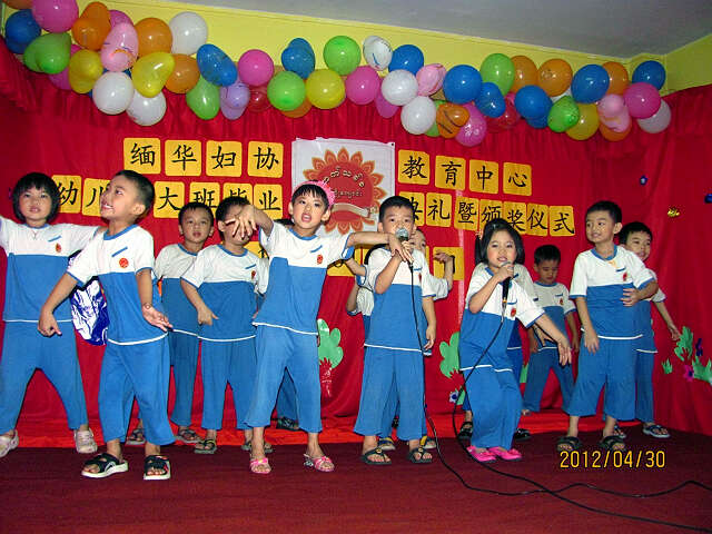 2012年4月30日上午9:30时,缅华妇女协会教育中心举办了一个别开生面的毕业典礼和颁奖仪式。在有限的空间里,老师们用桌椅搭起一个简单漂亮的小舞台,五彩缤纷的气球和卡通漫画,将小舞台点缀得充满节日喜庆。小朋友们叽叽喳喳欢聚一堂,老师们紧张而有条不紊地繁忙着,妇协领导和家长们与小朋友一起等待着庄严活泼的毕业典礼……