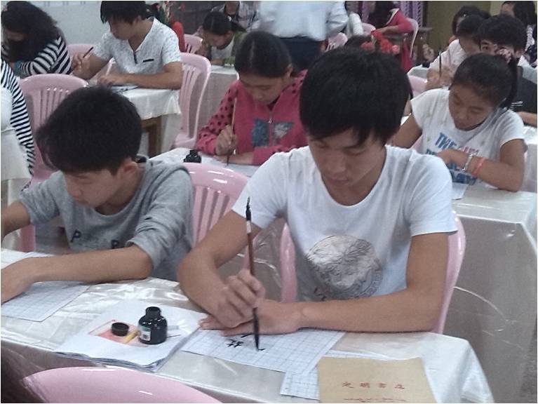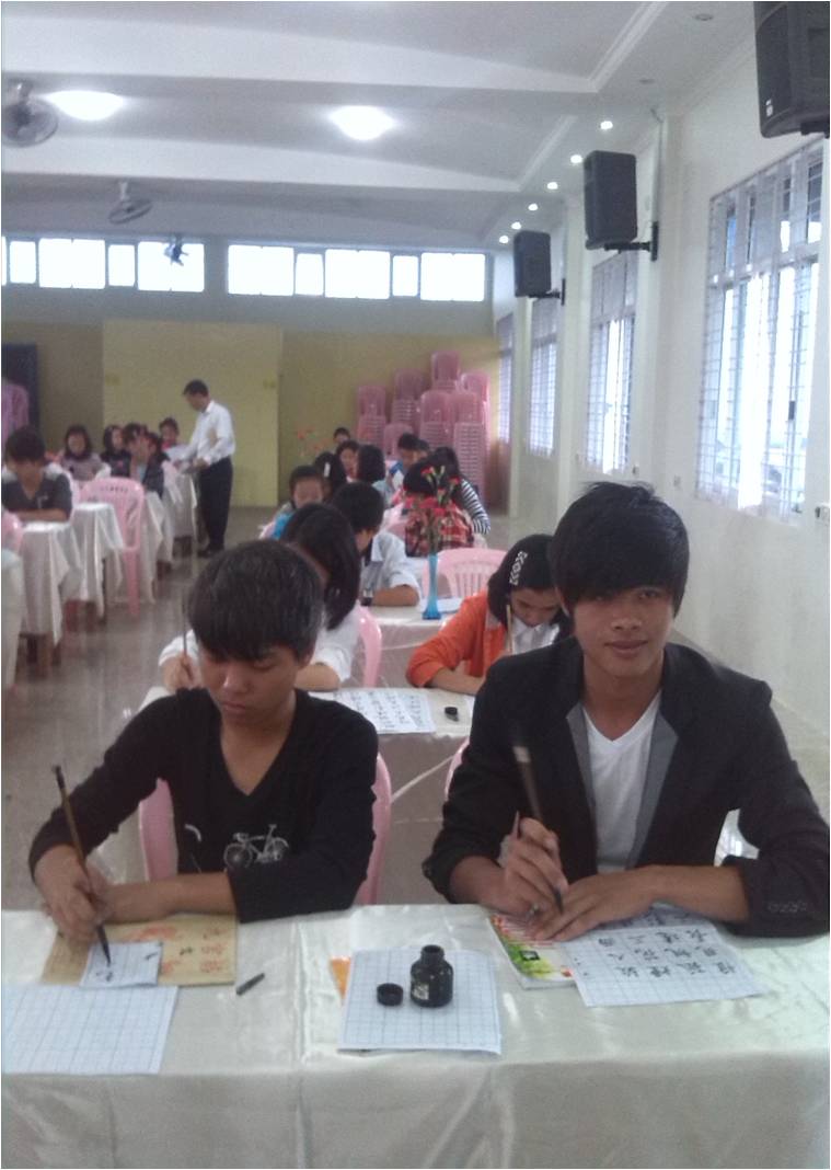 5月18日上午腊戌明德总校在窗明几净的礼堂,举办校内书法大赛,全校各班均派出学生参与,总共一百一十二名学生参加比赛。赛场均由学校年轻教师一番布置,别开生面。近三十张书桌上以白缎铺盖,每张书桌上都有鲜花一瓶,康乃馨和红玫瑰散出阵阵清香。整个赛场洋溢着古色古香的书院气氛,让参赛者心旷神怡。