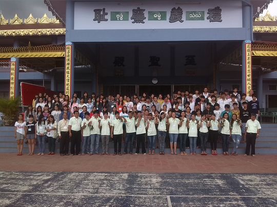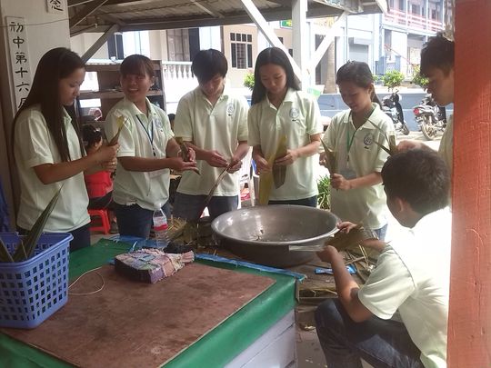 说是说缅甸华人传统文化氛围浓厚,可是已读高中的自治会同学,还真没有亲手包过粽子。爱心妈妈们并不嫌同学们笨拙,从头到尾每道工序悉心指导。这包粽子还真不是盖的:从煮粽叶,撕扎粽子的篾丝,到泡糯米,配拌材料,最后包扎成型,还要如果蒸煮。哪一道工序马虎,都会导致失败。这几位爱心妈妈还有一手绝招,他们首先将糯米弄得六分成熟,而后稍蒸一下,待粽子成熟透了,且香气更浓郁。