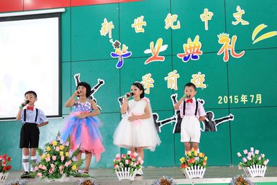 文艺汇演中,近百名学前班的孩子,向与会家长展示了在新世纪学校的汉语水平和综合素质方面的成绩。刚来幼稚园还不会说汉语的孩子们,用一口流利的普通话,征服了在场的家长;主持节目、发表讲话、台上台下汉语互动,以及演唱中文歌曲,舞蹈表演等形式,赢得了家长热烈掌声。