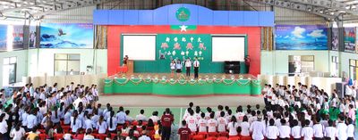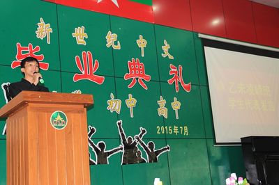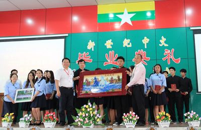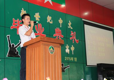 高中毕业生代表赵光盛,在发言中向学校和老师致以了诚挚的感谢,他说,他和同学们在新世纪不只是一口流利的普通话,更懂得了“珍惜生命、学会生存、创造生活”的深刻内涵,懂得了要要把所学知识应用到自己的生活实践中去,做一个知恩感恩、有益缅中友好的人,明白了只有为家庭、为社会创造价值的人生才有意义。他还说:“学校每年都尽力为我们申请到中国参加冬夏令营的机会,今年又为我们高中毕业班的8名同学,申请了中国大学留学资格,其中,包括我在内的7名同学还拿到了高额的‘留学奖学金’,而这些,新世纪没有收我们一分钱,这让我们太感动了,我要和所有毕业生一起,大声说一声——新世纪,我爱您!老师,谢谢您!”。赵光盛的发言,引起整个会场,一片鼓掌欢呼。