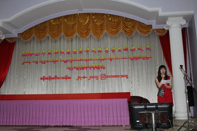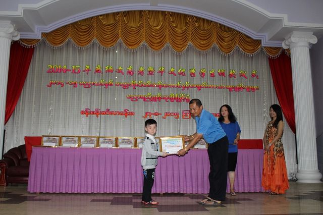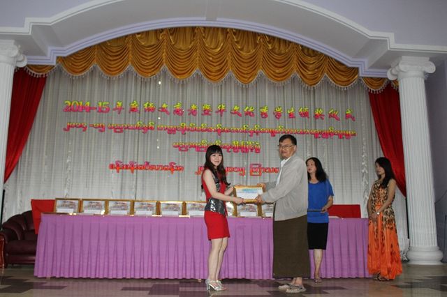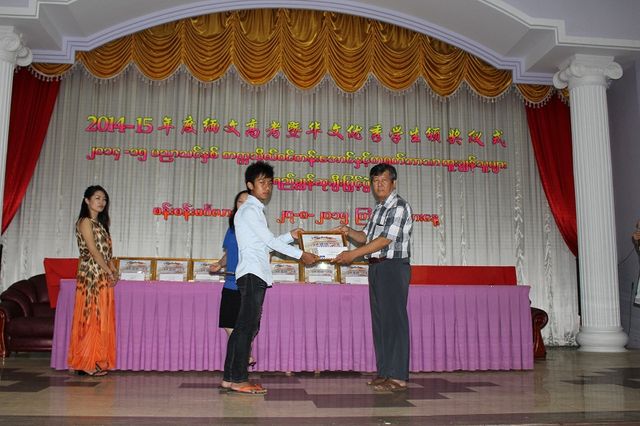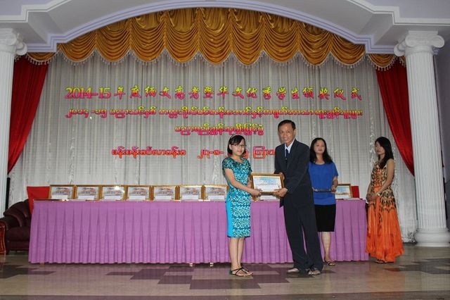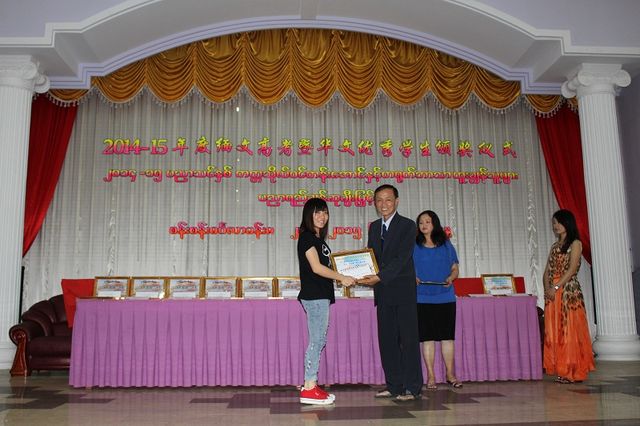 接着就进行了颁奖仪式,得奖者一共有二十五位,分为三个部分依次上台领奖,第一个部分是给中文在各班级中考上前三名的四名优秀学生颁发奖金和奖杯,他们分别是幼一甲班第三名杨伟,六年级第二名王丹,初中二年级林珠英,高中一年级第二名杨宝榕;第二个部分是给在HSK考试中分别取得优异成绩的四名优秀学生颁发奖金和奖杯,他们分别是考上HSK四级的徐彩莲,考上HSK五级的林淑蓉和林珠英,考上HSK六级的杨宝榕。最后一个部分是给今年考上缅文高考的十七名优秀学生颁发奖金和奖杯。
