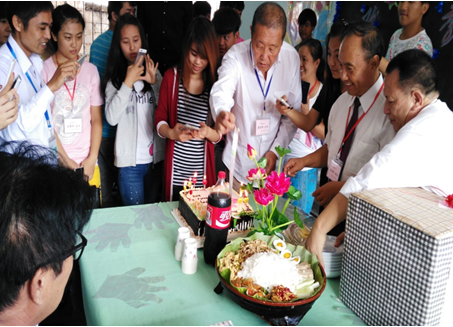 会场桌凳摆放也自成格局。同学将全班课桌摆成四个大方台,铺上粉绿色桌布、几瓶鲜花点缀其中,甚是大气有致。特别表现同学妙思巧想的是增添了餐饮的项目,专门订来的素食手抓饭,用小鼎摆在上面,阵阵香气散发着同学们的敬师诚意。当然,那一大块巧克力蛋糕,也是少不了的。