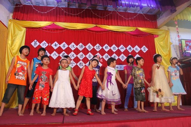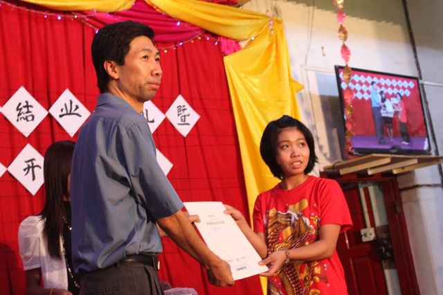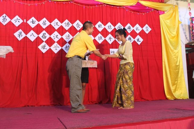 在旺兰教学点举行了第六届、第七届会话班结业典礼暨第八届会话班开班典礼。在典礼上,还为参加今年HSK考试学生颁发了证书及奖金。学习汉语学生不仅有华人后裔、还有当地缅族人,体现了福庆孔子课堂一贯坚持的“人人学汉语”的正确方针;学生们还表演了精心准备的文艺节目。旺兰教学点表演的节目有:傣族舞、精武门、芭蕾舞……等;啤谬教学点学员表演的节目有:彝族烟盒舞、藏族舞、诗歌朗诵……等。同学们能歌善舞,充分体现了“轻松学习”的气氛;学生们获取了HSK证书及成绩单,在福庆孔子课堂介绍的各类奖学金以及前往中国深造学员们的影响下,向往着前往中国读书深造的途径,努力实现“成就未来”之目标。