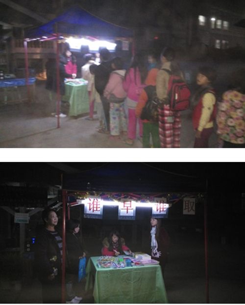 早到的前100名同学可以领取礼物票,待一个星期结束后,再来核算谁领票数最多和票号连续较前的10名同学,可以领取到精美的礼品,其余90名则随机发送爱心礼品。果然,小摊内精美的礼品,确实受到学生们青睐。举办的第二天,到校的同学明显比前一天增多了许多。同学们争先恐后地抢着到校。为的是,想要领取较前面的票号,取到较好的精美礼品。看到同学们欣然领取到那一张礼物票,及校长赠送的爱心糕点,露出天真的笑容时,举办活动的老师们,在冷风中感觉分外温暖,露出了欣喜的笑颜。
