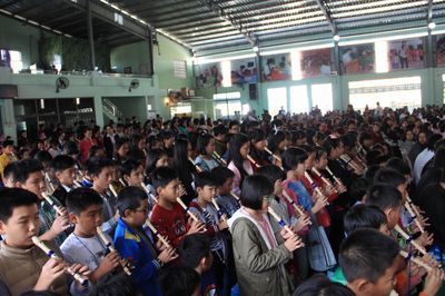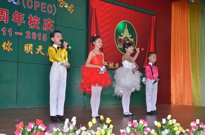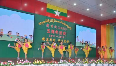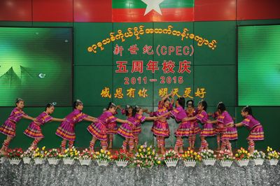 随后,五周年庆典文艺演出伊始,在演出开始前,由两位平均年龄不足8岁的一年级学生,电子琴伴奏并指挥的200余人的竖笛集体演奏《感恩歌》《歌声与微笑》震撼全场。随后,四位平均年龄不到11岁的主持人一登台,标准的普通话,流利的缅语、英语,赢得了现场观众的热烈掌声。紧接着是由幼稚园的小朋友带来的舞蹈《我最棒》、中学生现场书法、集体朗诵《壮哉,缅甸少年》等节目更是精彩绝伦。在文艺汇演即将结束的时候,伴随着《明天会更好》的音乐响起,所有的演员一起上台跟着哼唱,再次将现场气氛推向高潮。精彩的演出不断博得在场观众的热烈掌声,充分展示了新世纪学校全体师生昂扬向上的精神风貌和素质教育的丰硕成果。