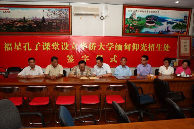 2012年9月21日上午8点整,福星孔子课堂在二楼会议室举行了设立华侨大学海外招生处签字仪式。根据该协议,中国国立华侨大学正式授权福星孔子课堂在缅甸仰光招收学生,学生根据自身条件可申请入读中国国立华侨大学的学士学位、硕士学位、博士学位以及预科课程,也可参加华文短期培训班。