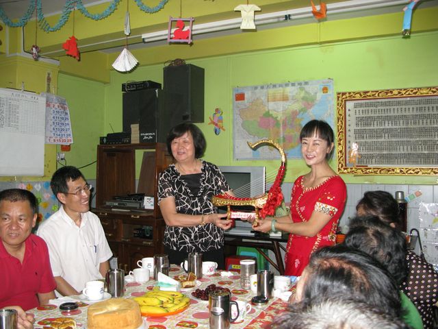 周老师表示,虽然外派任务结束,仍然会继续关心学校的发展。回国后将在幼儿图书收集和联系教材、寄送等方面,继续支持帮助学校,并希望今后两所学校能进一步加强沟通与合作,双方在办校等方面更上一个新的台阶。随后周佳老师分别向大家敬茶,表达谢意。我校老师们向周老师赠送礼物,合影留念。