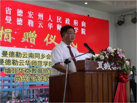 捐赠仪式上,尚兴玺先生首先代表曼德勒云南同乡会、曼德勒云华师范学院和缅北华文教育协会,向孔副州长一行的到来表示热烈的欢迎!他简要介绍了曼德勒云南同乡会基本情况与云华师范学院办学宗旨,并对云南省德宏州人民政府的捐助表达了诚挚的谢意。他说,“这次孔副州长一行的‘爱心之举’使我们深受感动,感激之心不胜言语!我们一定会充分利用好每一份捐助,绝不辜负王俊强书记和州委州政府及家乡父老对我们的期望。我们学院作为祖籍国国侨办华文教育示范学校,在努力实现学院自身发展的同时,通过从教师、教材、教法、考试等方面,对其他华校进行引导和帮扶。使其办学有“规”可依,教学有“章”可循。为推动缅甸华文教育向标准化、正规化、专业化转型升级做出贡献。”