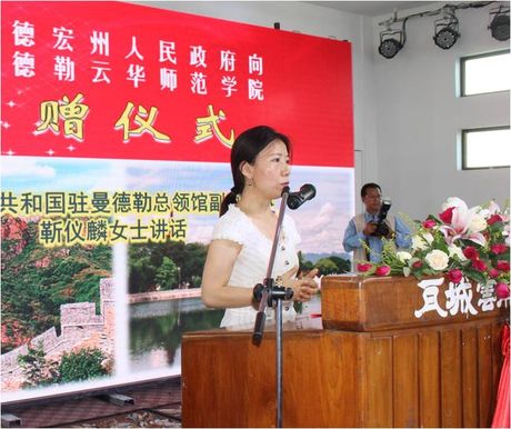 中国人民共和国驻曼德勒总领馆副总领事靳仪麟女士代表总领馆祝贺学院获得捐款,感谢德宏州长期以来对缅甸华文教育工作的大力支持。并嘱咐同学们珍惜机会、努力学习,随时心存感恩,感恩侨领、感恩祖籍国,不负祖籍国和侨领们寄予的厚望。她表示,总领导馆将会一如继往地支持曼德勒云华师范学院的发展。