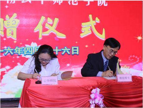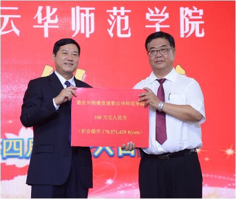 2016年4月27日下午,在曼德勒云华师范学院礼堂隆重举行德宏州人民政府向云华师范学院捐赠教学经费仪式。德宏州委常委、州人民政府常务副州长孔勒干先生一行14人,中国驻曼德勒总领事馆副总领事靳仪麟女士,德宏州驻曼德勒商务代表处主任李其贵先生,云南海外文化教育中心缅甸分中心主任唐建军先生,缅甸曼德勒云南同乡会理事长、云华师范学院董事长、缅北华文教育协会会长尚兴玺先生及学院校董等嘉宾和师生代表共300人参加活动。