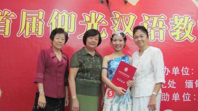 最后校领导送陈莉莉老师一条白金项链,以资奖励其荣获“首届仰光汉语教师技能大赛”一等奖,希望陈莉莉老师往后再接再厉。陈莉莉老师随之发言感谢校领导们的鼓励。妇协的阿姨们和校领导以及老师们都分别给外派教师献上了欢迎词,给获奖老师们说了恭贺词,最后会议在欢乐的歌声与翩翩的舞姿中画上了句号。