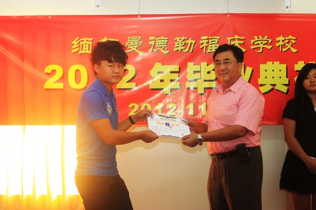 11月10日,上午九时,于曼德勒福庆孔子课堂五层大堂举行2012年度颁奖典礼。其中包括颁发:HSK证书、第二十届初级班毕业证书、第十四届中级班毕业证书、第十三届世界华人学生作文比赛优秀生奖、第十三届世界华人学生作文比赛辅导教师奖、2012年第一期看电视决赛奖等奖项。福庆学校李祖清校长、孔子课堂中方院长何林博士、云南海外文化交流中心曼德勒分中心唐建军主任以及学校师生等都参加了典礼。由此次活动可以获悉,福庆学校从以前的传统毕业典礼,发展到现在多元化的颁奖项目,学校以“人人学汉语”、“轻松学习”、“成就未来”的口号,在多层次多方面得以发展,学校举办的各类活动深受学生们的喜爱与捧场。