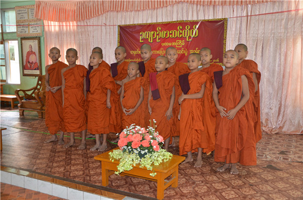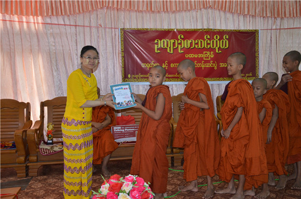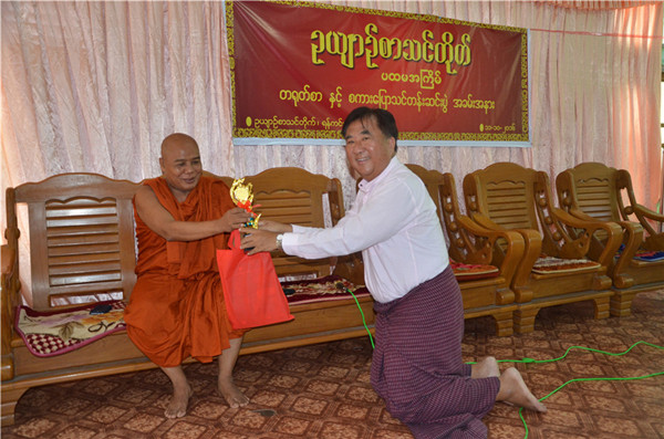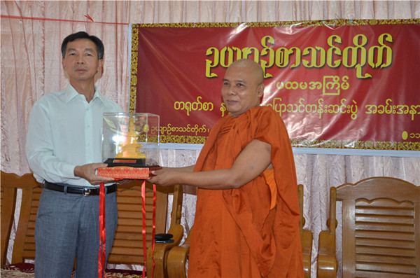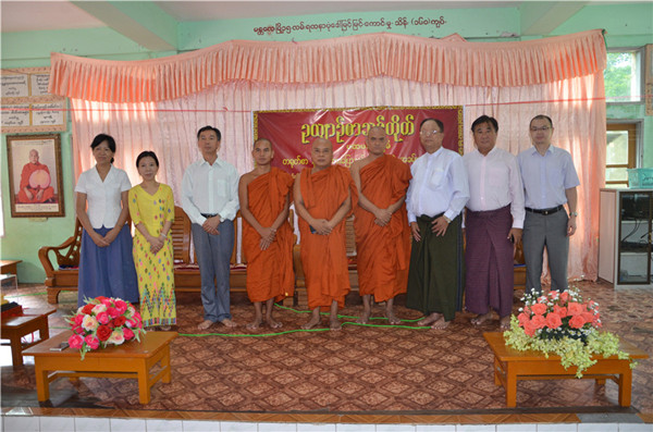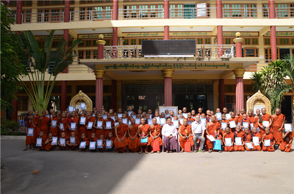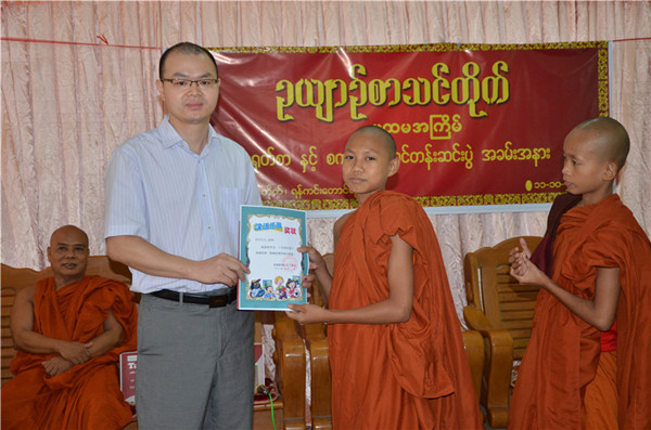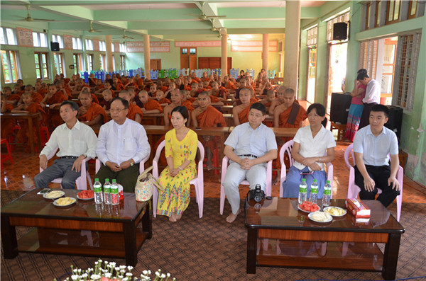李校长给大家介绍,中缅两国不仅山水相连,互为邻居,同时还拥有相同的宗教信仰。李校长说,半年前吴英寺的两位‘鹏鹏’由于学习汉语成绩优秀,被总领事馆安排前往访华。过几天吴英寺的主持高僧佐迪嘎师父,又要跟随马索英寺佛学院高僧团访华拜佛,总领事馆安排前往北京灵光寺参拜佛牙舍利,到西安法门寺参拜佛指舍利,回来后一定会有许多中国行的动人经验与大家分享。李校长鼓励僧侣学员们努力学好中文,为佛教的发扬光大,为促进中缅胞波情的源远流长,而做最大的努力。