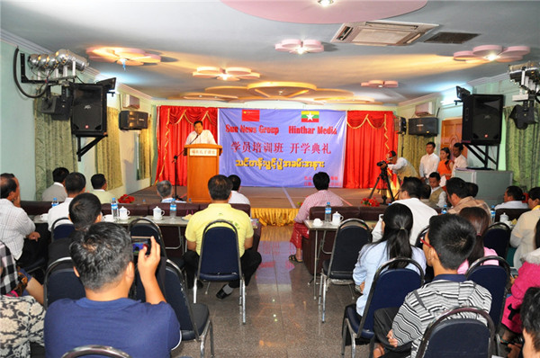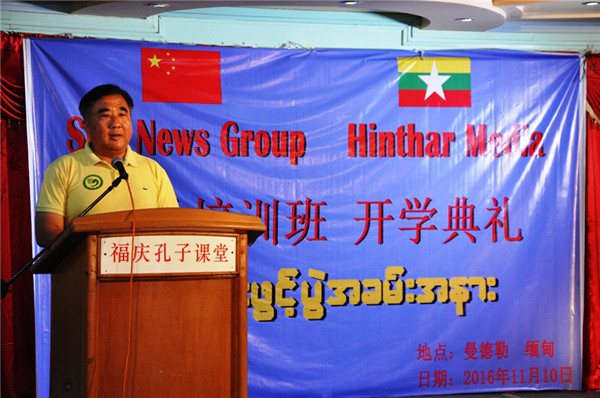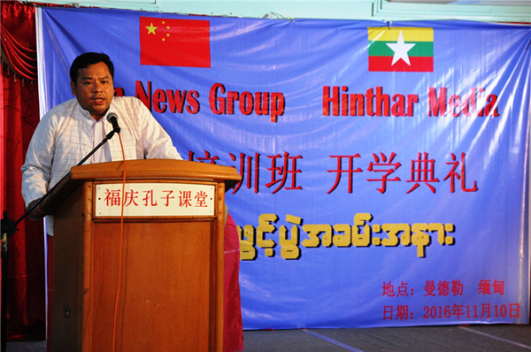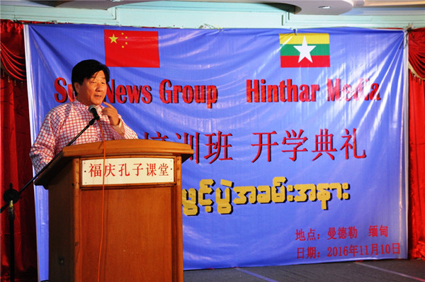 11月10日上午10时,中国阳光新闻集团(Sun News Group)与缅甸亨达(Hinthar media)媒体集团在福庆孔子课堂多功能厅举行学员(汉语强化)培训班开班典礼。曼德勒省教育局副局长吴钦貌敏、缅甸亨达媒体总裁敏斑雅散、中国阳光新闻集团副总裁马骏、曼德勒PLG(Peace &Love Group)民间组织负责人、福庆学校董事会董事长黄鹏飞、福庆学校校长孔子课堂缅方主任李祖清博士、阳光新闻集团与亨达媒体职员、参加培训班的学员参加了活动。