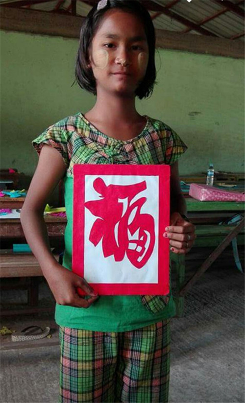 目前,中国的剪纸很受缅甸寺庙学校汉语小朋友们的欢迎。他们都喜欢上了中国的剪纸。他们比较喜欢剪刻文字、窗花及动物。尤其是文字“双喜”,特别受欢迎。而且很多寺庙学校的小朋友们剪出来的“双喜”字和“福”字特别精致而美丽,也有的小朋友们喜欢建动物样子,如“大熊猫、小白兔”,还有的小朋友们喜欢剪“雪花”等等。
