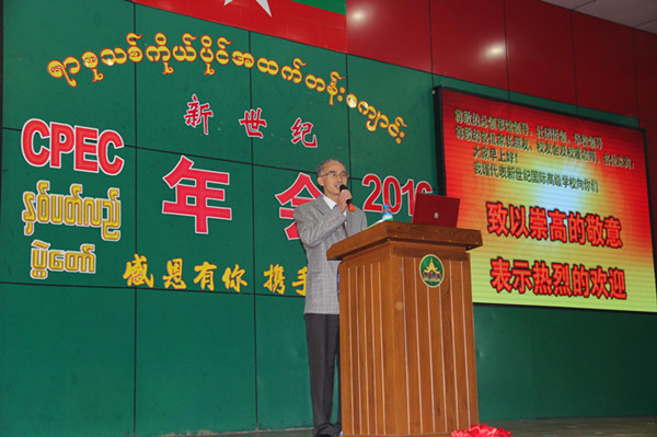 12月24日,新世纪教育(CPEC)曼德勒新世纪国际高级学校隆重举行“感恩有你,携手同行” 2016年会庆典活动。中国驻曼德勒总领馆、云南驻曼德勒海外文化交流中心、曼德勒金多堰慈善总会、曼德勒华助中心,云南、广东等同乡会、妇女联谊会等社团组织,孔教、明德、云华、昌华等华校代表,以及新世纪学生家长、董事会、校友会和全体师生,共2200余人参加了庆典活动。
