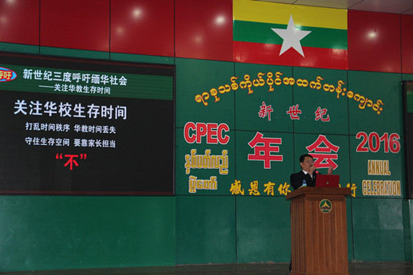 张校长表示:“新世纪能有今天的成绩,得益于缅华教育‘先贤前辈铺路’,新世纪人‘站在巨人肩上’。每一个成绩,都充满了新世纪人的汗水和心血;每一个进步,都离不开社会各界和家长们的关心与支持。走过2016,我们感恩有你,新世纪教育得以发展;展望2017,我们携手同行,缅华教育再铸辉煌。新世纪人愿与大家一道,为‘传播优秀文化、服务缅华社会、增进缅中友好’而不懈努力,为‘培养未来社会需要的能为社会创造财富的精英人才奠定基础’,作缅中友好的使者。我以今生付缅华,因为,我们是一家人。”
