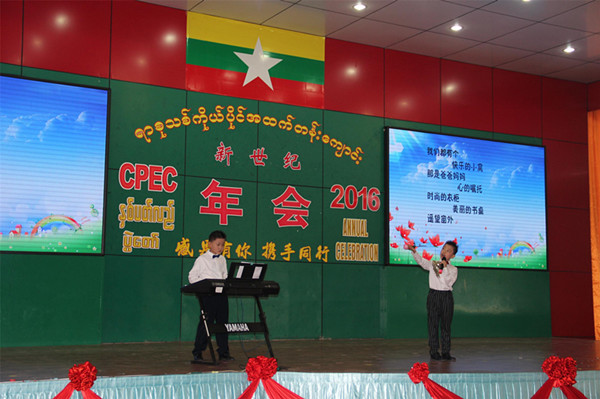 接下来是最让人期待的盛大的年会文艺演出。在全场共同唱响的国歌和校歌声中,演出拉开了帷幕。四位平均年龄10岁的主持人一登台,全场报以热烈的掌声,他们标准流利的普通话、缅语、英语,一下就征服了全场观众。接着,由小学低段同学表演的舞蹈《看戏》、幼稚园的小朋友带来的舞蹈《圈圈乐》、中学生《书琴韵、太极魂》的现场表演以及相声、独唱等节目更是精彩绝伦。精彩的演出不断博得在场观众的热烈掌声,充分展示了新世纪学校全体师生昂扬向上的精神风貌和素质教育的丰硕成果。最后,全校师生共同的手语表演《感恩的心》更是震撼全场,一段表达“子欲孝而亲不待”人生最大的遗憾的感恩词,感动得数百人留下了热泪,把整场活动推向高潮,赢得了现场观众经久不息的掌声和喝彩声,为本次年会庆典活动画上了完美的句号。