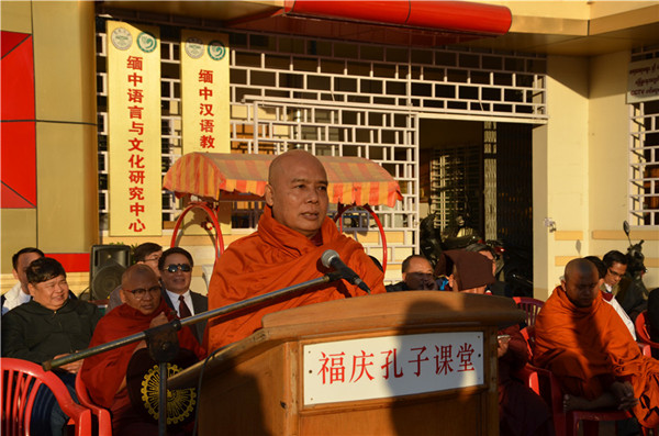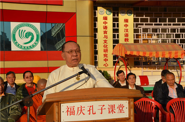 王宗颖总领事说有健康的身体,才有美好的未来,鼓励大家锻炼身体,学好中文,做缅中友好的使者;吴英寺住持高僧讲述了自己学习汉语以及访华的经过,他告诉大家一定要实现他的‘学好中文的梦想’;吴觉丹吞博士则告诉大家,不久的将来,汉语就要进入国家议会,学习国际语言(联合国通用语)汉语是十分必要的,他鼓励大家学好中文,为缅甸的建设作出贡献;吴觉温副会长向荣获“先进孔子课堂”荣誉的福庆孔子课堂表示祝贺,并承诺友协一定为缅中友好努力!