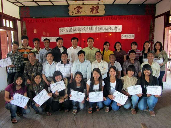 据悉,几乎同一时间,春节刚过,还有三位福庆孔子课堂高学历本土教师,也前往缅北曼沾地区为周边地区汉语教师举行汉语国际化教师培训班。2月19日早晨,于曼沾勐稳中学举行南渡、曼东、南山三区域华校的2013年度教师培训班结业典礼。中国驻曼德勒总领事馆杜振权领事、曼德勒孔子课堂中方主任何林副教授、曼德勒福庆学校李祖清博士以及三区域的校领导、师生近百人出席。