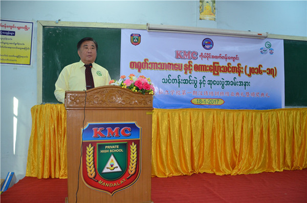 中华人民共和国驻曼德勒总领事馆王宗颖总领事、KMC私立学校林春贵校长、福庆孔子课堂缅方主任/福庆学校校长李祖清博士等分别致词。KMC私立学校林春贵校长首先致谢嘉宾,他介绍说,KMC不仅是自己名字(Khin Maung Cho)的第一个字母的缩写,而且还包含“学识、道德、信心”三个英语词汇,他鼓励学生们跟学校名字一样,增强信心,努力学习。他说,听到中文班的学员们此次参加HSK汉语水平考试,竟有两位获得满分!他感到十分满意,他说,还有学员们参加了HSK冬令营,更是喜上加喜!他承诺,一定将汉语班搞得更好。他感谢总领事馆与福庆孔子课堂对汉语国际推广,所做的努力与支持。