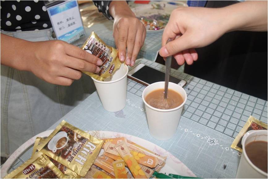 活动过程中,教师依据自己的口味选取自己喜欢的饮品,食品。并进行投票领取纪念品。教师们开心的吃着食物,喝着咖啡,拍着照片,每一个人脸上都洋溢着幸福的笑容。在活动过程中可以听到“这个鱼骨头好吃,给你尝尝。”“帮我冲杯奶茶,谢谢啦!”“给你尝尝榴莲糖,别想着闻着难闻,但吃起来特别香!”“西瓜没有了,等等我再去切点。”等各位教师之间的对话。