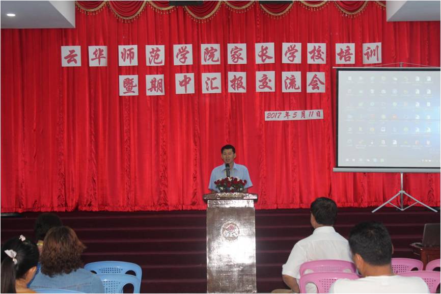 2017年5月11日上午6点30分,云华师范学院在四楼礼堂成功举行了二次家长学校培训暨期中汇报交流会。云华师范学院董事长尚兴玺先生、云华师范学院院长李岚女士和学院特聘教授克瑞思先生(美国)共同出席了培训交流会,杨周常务副院长主持会议。