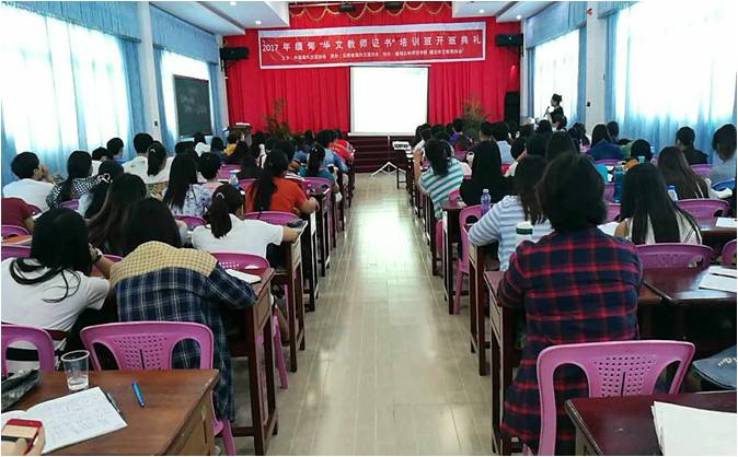 由中国海外交流协会主办、云南省海外交流协会承办、缅甸云华师范学院和缅北华文教育协会协办的2017年缅甸“华文教师证书”培训班,于7月21日上午在云华师范学院礼堂隆重举行开班典礼。