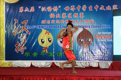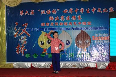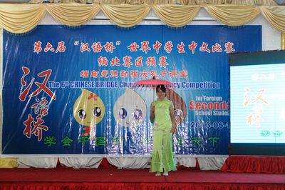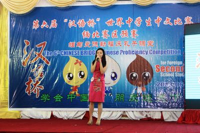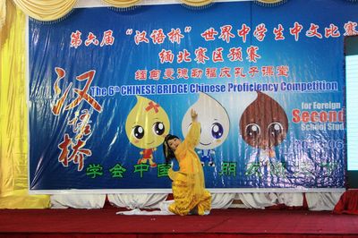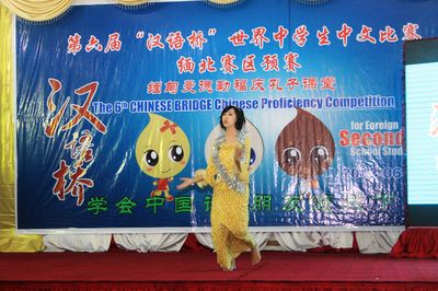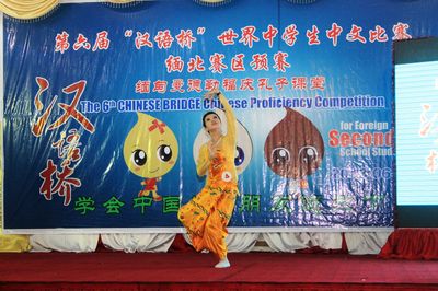 2013年6月16日,上午9时,中国驻曼德勒总领事馆主办,曼德勒福庆孔子课堂承办的“学会中国话,朋友遍天下”为主题的“第六届汉语桥世界中学生中文比赛”,于“曼德勒酒店HOTEL MANDALAY”大礼堂内隆重举行。来自缅北地区腊戌、八莫、抹谷、彬乌伦、漫沾、东枝、皎脉、曼德勒等城市,20多所汉语教学机构的25位学生参赛。比赛分为多个环节:演讲比赛、汉语及中华文化知识笔试、已于昨日6月15日在福庆孔子课堂内举行,今日继续比拼才艺表演。参赛学生都是各所学校精选出来的优秀生佼佼者,因此比赛进行得十分激烈。