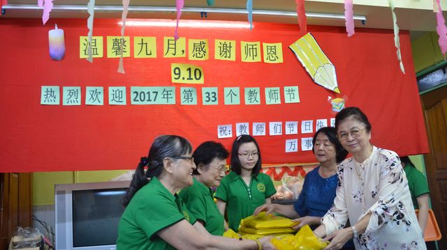 而后,妇协的阿姨们和校委们、学校为全体老师送上了许多丰富的教师节礼物。其中有李为华主席、叶雪金主任、校委江彩玉、郑美慧、黄秀智为大家送上了祝福和礼物。礼物有好看的纱笼、背包,好吃的美食等等。最后,叶雪金主任还为大家准备了椰奶面,大家一边品尝着美食,一边说说笑笑的过了一个完美幸福快乐的教师节。