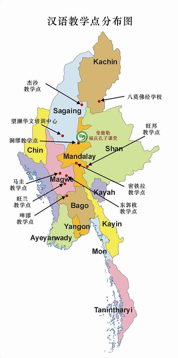 继此,克钦邦的八莫市侨领前来接洽。八莫佛经华校是一所历史较悠久的华校,但是一直采用落伍的台湾教材,与当前的市场需求,学生的真正需要,形成差距,根本无法与时俱进。八莫佛经学校董事会决心学习福庆的经验,走汉语国际化的道路。目前,福庆派一位副校长兼教务主任以及两位汉语教师前往八莫。2013年9月,八莫华校有一位教师,经福庆学校的推荐,即将前往北京中央民大,就读汉语国际专业硕士班,享受孔子学院全额奖学金。福庆正在为八莫的师资队伍的建立,做最大的努力。在当地董事会的要求下,福庆汉语教学中心,又先后向实杰省的望濑市、杰沙市、马圭省的东敦枝市、曼德勒省的洞缪市、继续外派本土教师。汉语教学点目前已达(10)个,涵盖了两个邦、四个省。福庆孔子课堂汉语教学点的影响力在增长。