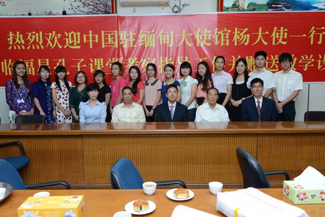 9月17日上午9时,中国驻缅甸大使馆向东方语言与商业中心赠送手提电脑及电脑配套器材的赠送仪式在东方语言与商业中心礼堂举行。杨厚兰大使、杨庆连主任及张鹏秘书出席了赠送仪式,受到东方语言与商业中心的八个创办单位的代表们及曾圆香董事长、黄爱玲校长的热烈欢迎。曾圆香董事长致词后,黄爱玲校长介绍中心的概况;杨厚兰大使在讲话中高度评价了学校的成绩和老师们的努力。赠送仪式完毕,学生们向杨大使表演节目。杨大使和校董们、老师们一起合照留影。