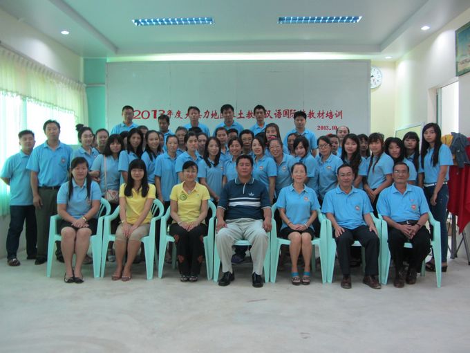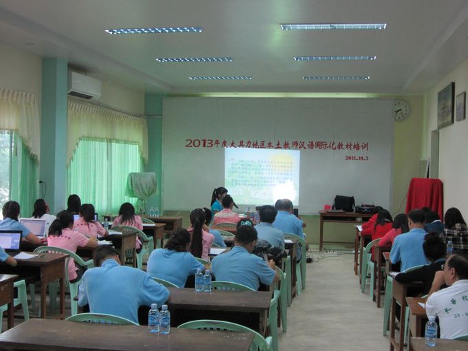 金秋十月、风和日丽的缅泰金三角洲边境地区大其力。10月3日的美好日子,大华佛经学校迎来了曼德勒福庆孔子课堂教务主任林仙珍老师与林嘉玉老师,在大礼堂会议室举办了2013年度大其力地区本土教师汉语国际化教材培训班。培训时间为一天六学时,共三天半20学时的紧张课程,在10月7日上午九时半结束。