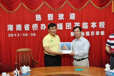 10月30日下午4:30时,海南省外事侨务办公室、海南省港澳事务办公室王胜主任为首的访缅团,莅临曼德勒福庆学校,并于集思阁会议室与校领导师生亲切座谈。据介绍,访问团此行主要目标为对海外华文教育及海外华人侨情调研。为了更多地了解缅甸华文教育情况与侨情,王主任一行于前日抵达仰光,今日来到曼德勒福庆学校,随后拜访曼德勒总领事馆郁伯仁领事。王主任表示首次来到曼德勒福庆学校,了解到福庆学校的发展情况使他感到喜出望外,让他认识到福庆从事华文教育的同时,还培养出促进中缅友好的桥梁人才,相信不久的未来,缅甸华文教育事业,一定能够大展宏图,更上一层楼!