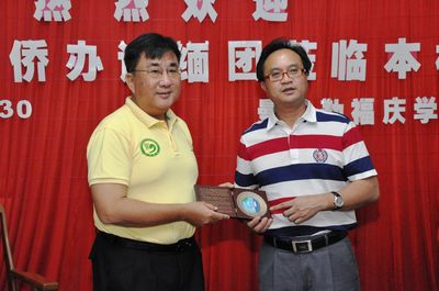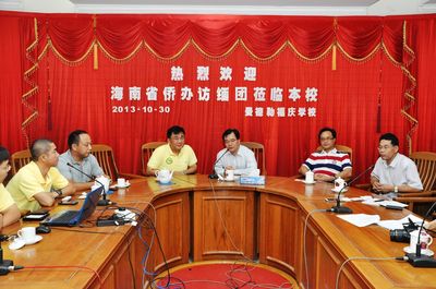 李祖清校长为首的校领导与海南省侨办主任一行,进行座谈。会后互赠纪念品。