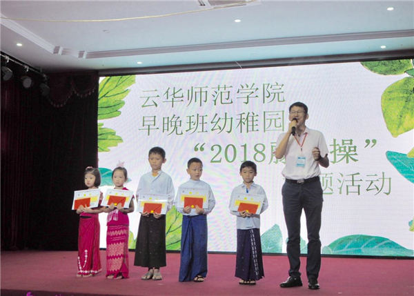 为促进幼儿德智体美全面发展,激发幼儿锻炼的兴趣,增强幼儿体质,培养幼儿初步的竞赛意识和团队合作精神,云华师范学院早晚 班幼稚园于5月5日在四楼礼堂开展了藤球操比赛活动。此次活动的开展旨在引导幼儿学会用心灵去感受和发现美,用自己的方式去表现美和创造美,促进幼儿的德智体美全面发展的同时弘扬缅甸传统文化,彰显校园文化。