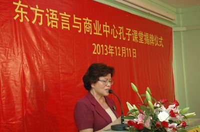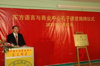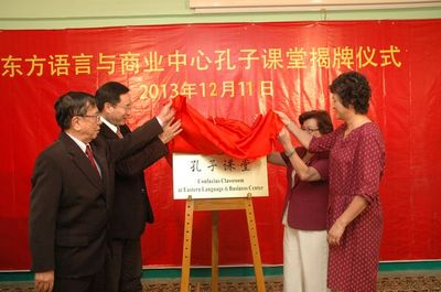 由仰光东方语言与商业中心和云南师范大学联合开办的"东方孔子课堂"今天下午一时在仰光东方语言与商业中心校舍第四楼举行揭牌仪式,中国驻缅甸特命全权大使夫人阮伟女士、云南师范大学杨校长及教务主任和教师们出席了揭牌仪式;东方语言与商业中心曾圆香董事长及校董们、缅华各界侨领社会贤达出席了仪式。